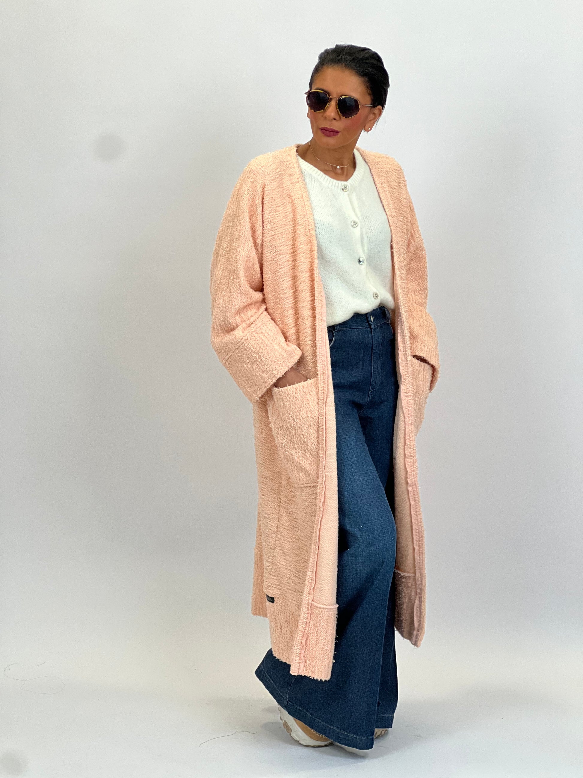 Le Kimono Pink Flemish en laine est la version rosé du creamy beige de la collection précédente, il est agrémenté d’une subtile touche argentée en forme de lignes discrètes, évoque l’élégance et le raffinement.