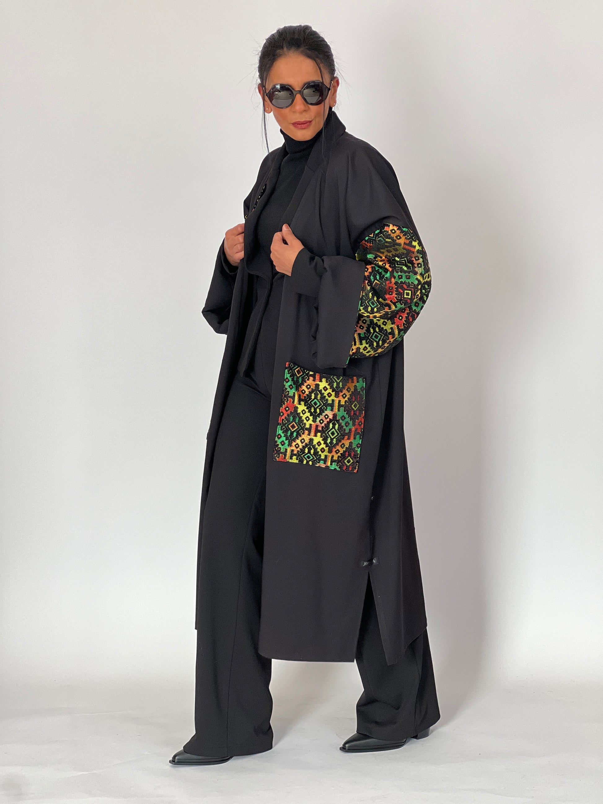 Ce kimono, à la fois sobre et sophistiqué, allie élégance moderne et touches traditionnelles. Les manches et les poches sont ornées d’un motif géométrique coloré, rappelant l’authenticité artisanale, qui contraste magnifiquement avec le noir profond du tissu principal. Sa coupe ample et ses finitions soignées en font une pièce polyvalente et raffinée, idéale pour une femme qui souhaite affirmer son style avec subtilité et audace.