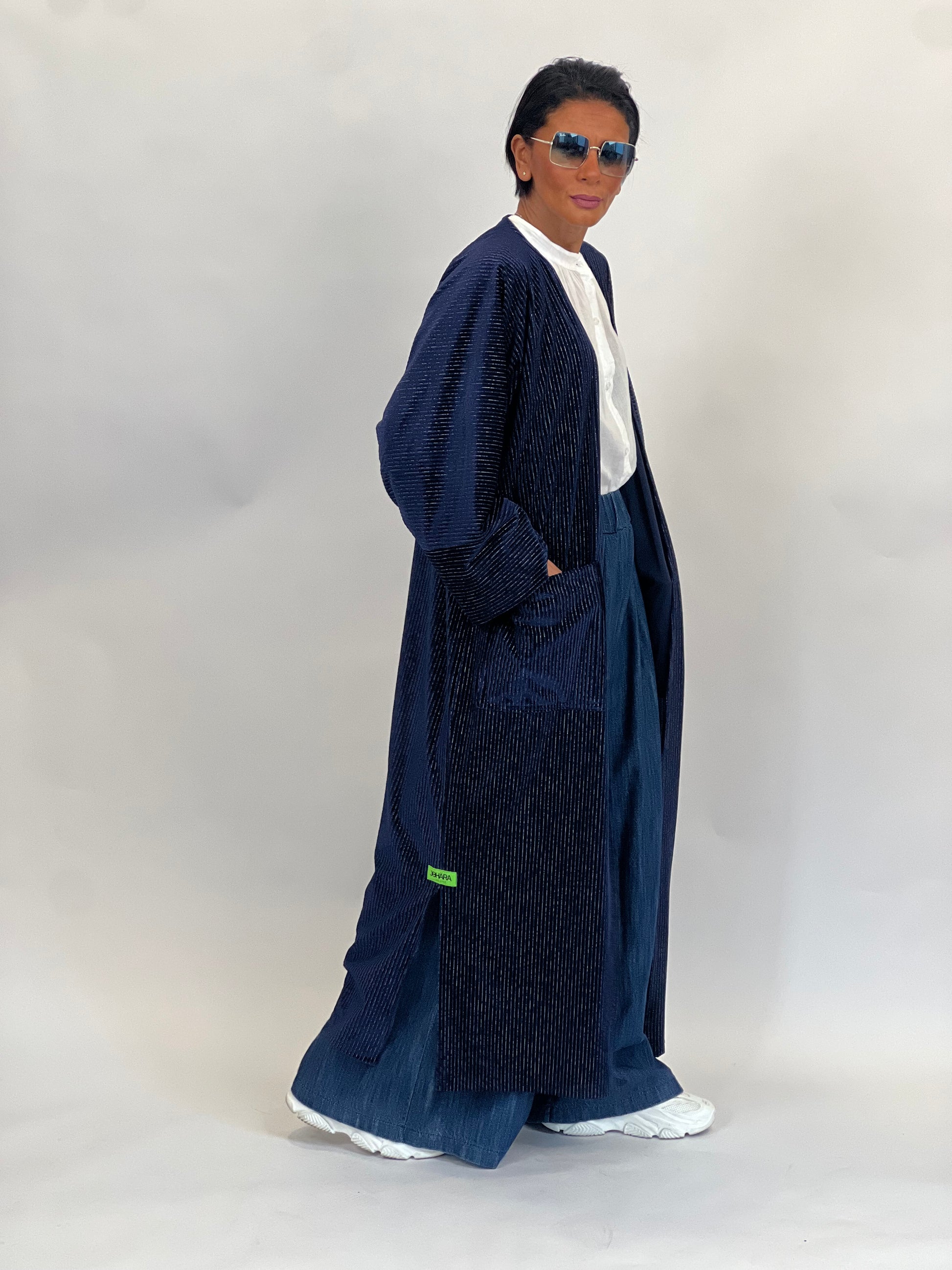 Ce kimono long en velours bleu profond, rehaussé de lignes dorées légères, évoque un ciel étoilé dans un textile luxueux. Fluide, doux et légèrement brillant, il capte la lumière avec discrétion pour un effet chic mais non ostentatoire. Sa coupe ample et structurée permet un tombé majestueux et confortable à la fois.