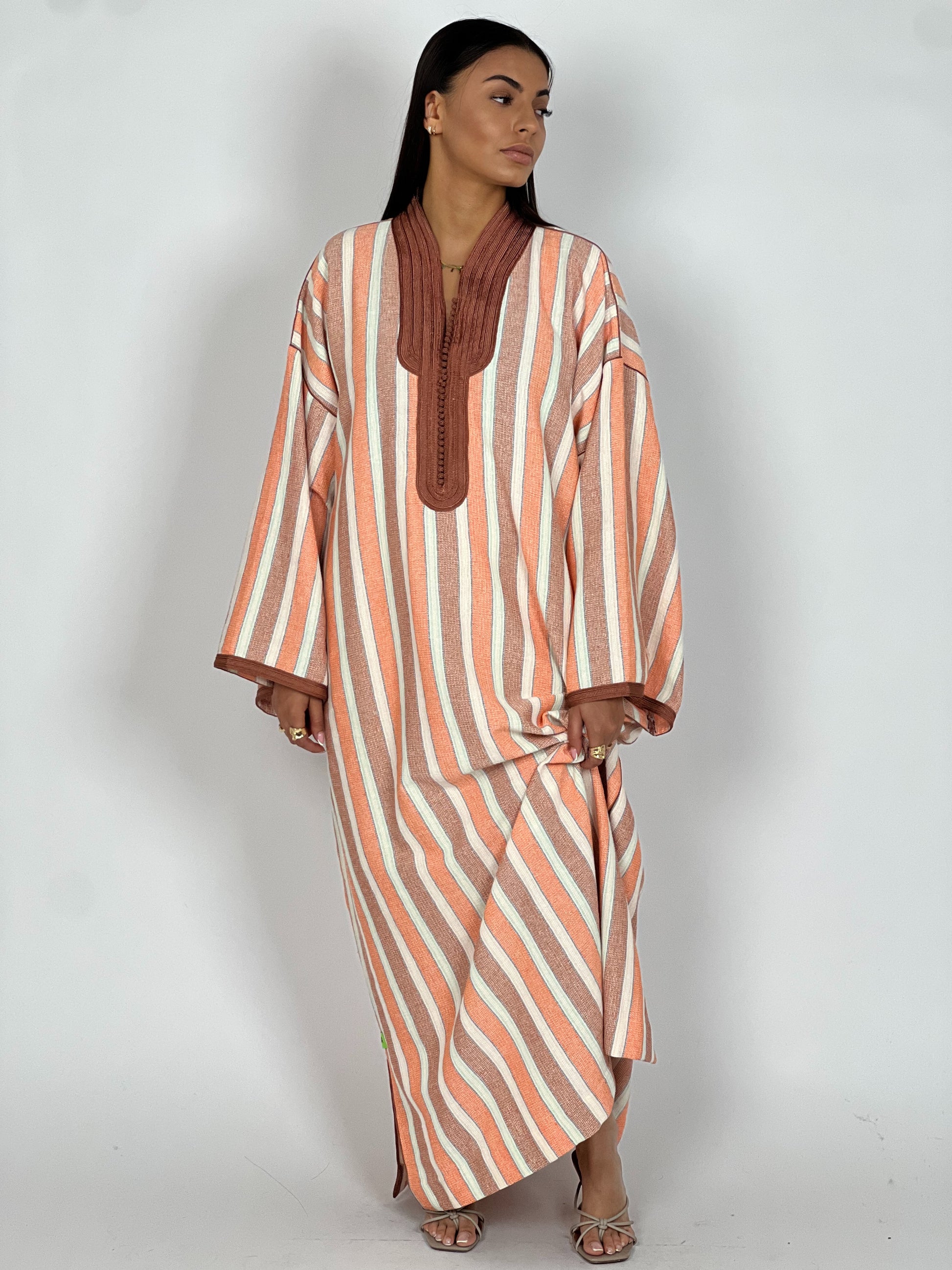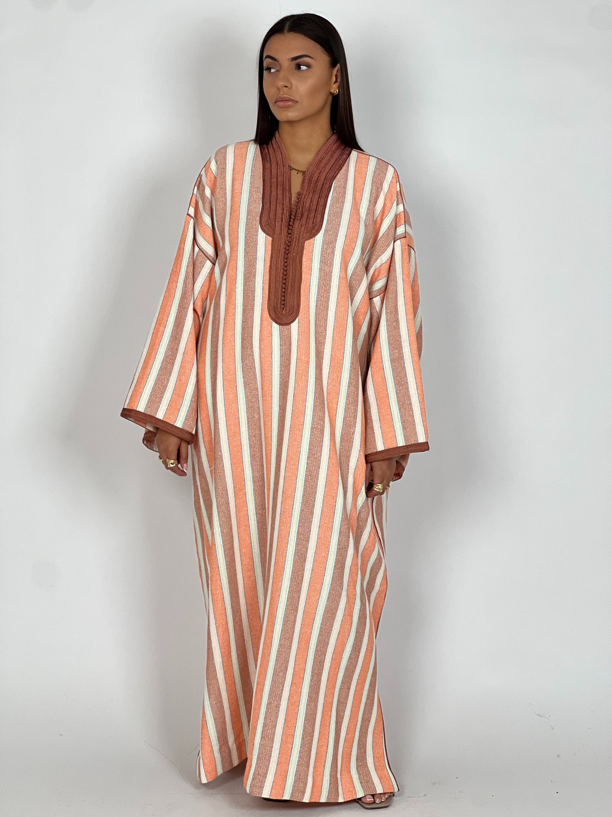 Avec ses teintes chaudes inspirées des argiles du Sud, la robe Terracotta célèbre la force douce de l’artisanat marocain. Confectionnée à la main, elle mêle rayures terracotta et sfifa chocolat faite main, pour une harmonie terreuse et solaire.
